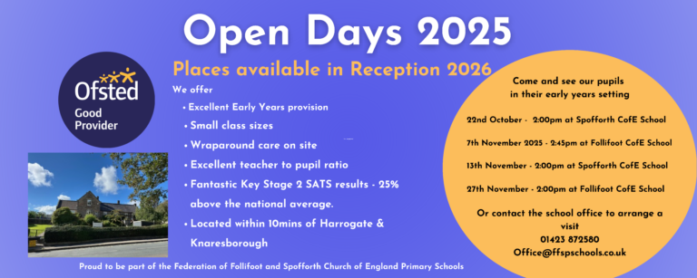 Welcome to Follifoot and Spofforth Church of England Primary Schools—two vibrant learning communities united by shared values, a deep sense of purpose, and a commitment to nurturing every child’s potential. Our motto —Love, Learn, Thrive— is at the heart of everything that we do.